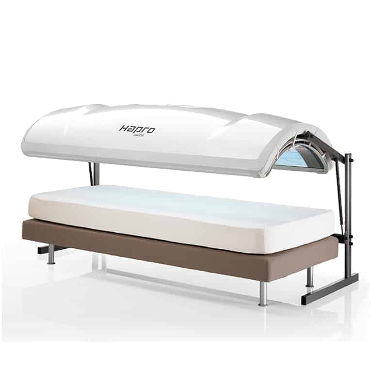 Om din önskan är att kombinera en lyxig känsla av rymd med en individuell liggkomfort, så rekommenderar vi varmt Hapro Jade T. Det integrerade, dubbla gasfjädersystemet gör att du enkelt kan placera soldelen på ett perfekt avstånd från din kropp. Du kan ligga på en yta helt efter eget val, med allt utrymme du önskar. Med Jade 12 solar ni helt enkelt med en perfekt komfort som ni själv har valt. Efter att ha njutit av din solningssession återställer du bara baldakinen till det platsbesparande ”viloläget”.