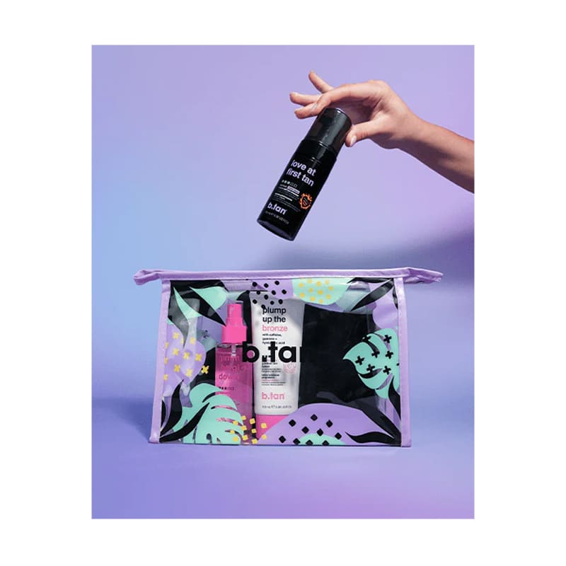 Love At First Tan Travel Gift Set är ett kit med brun-utan-sol produkter. Kittet inkluderar en brun-utan-sol i mousse-form, en lotion för gradvis solbränna, bronzing glow droppar samt en appliceringshandske – alla i perfekt resestorlek. Produkterna är 100% veganska och fria från parabener.