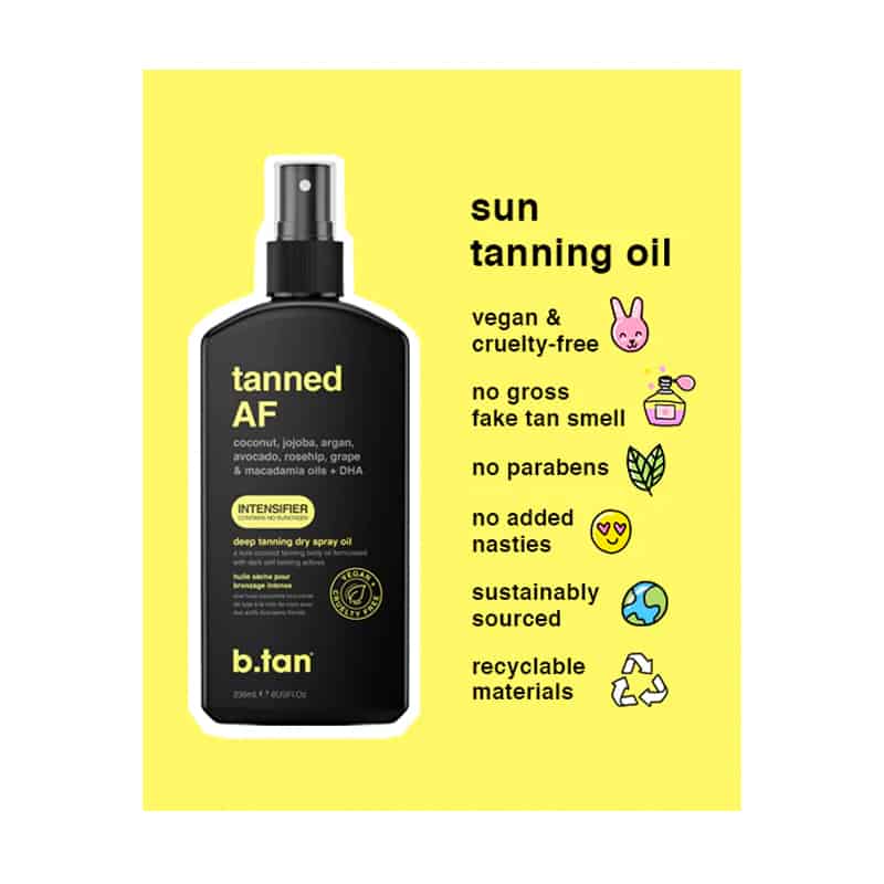 B.tans Tanned AF-olja är en kroppsolja med 7 olika växtoljor formulerade för solbad, tillsatt med naturliga DHA-färgaktiverare för att främja processen, så att du snabbt uppnår den vackraste sommarbränna med en djup färg. Ju oftare du applicerar oljan, desto mer kan du bygga upp solbrännan som du alltid har drömt om. Är du redo att bli Tanned AF?