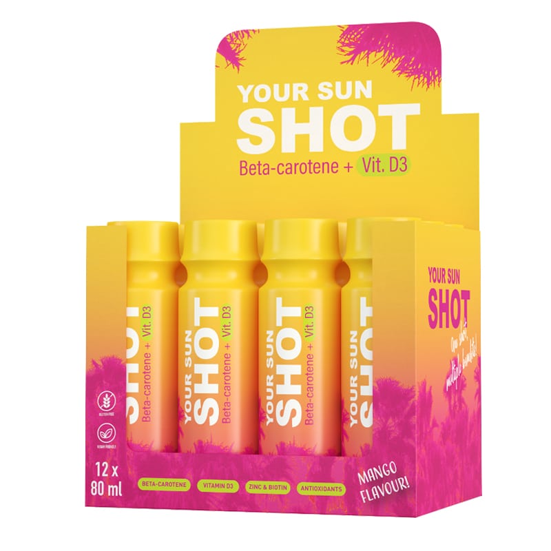 En vitamindryck som ger en ökad effekt och mottaglighet av din tid i solariet eller om du solar utomhus. Sun Shot Mango fungerar inifrån och innehåller Betakaroten och Vitamin D3, som omedelbart förbättrar resultatet, dvs en tydligare och djupare gyllene solbränna. En 100 % framgångsrik solning bör ske i 3 steg: Applicera en solförstärkare, drick en shot, gå och sola.